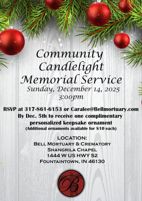 On Sunday, December 14, at 3:00 p.m. at Bell Mortuary & Cremator Shangrila Chapel (1444 W US Hwy 52, Fountaintown, IN 46130).